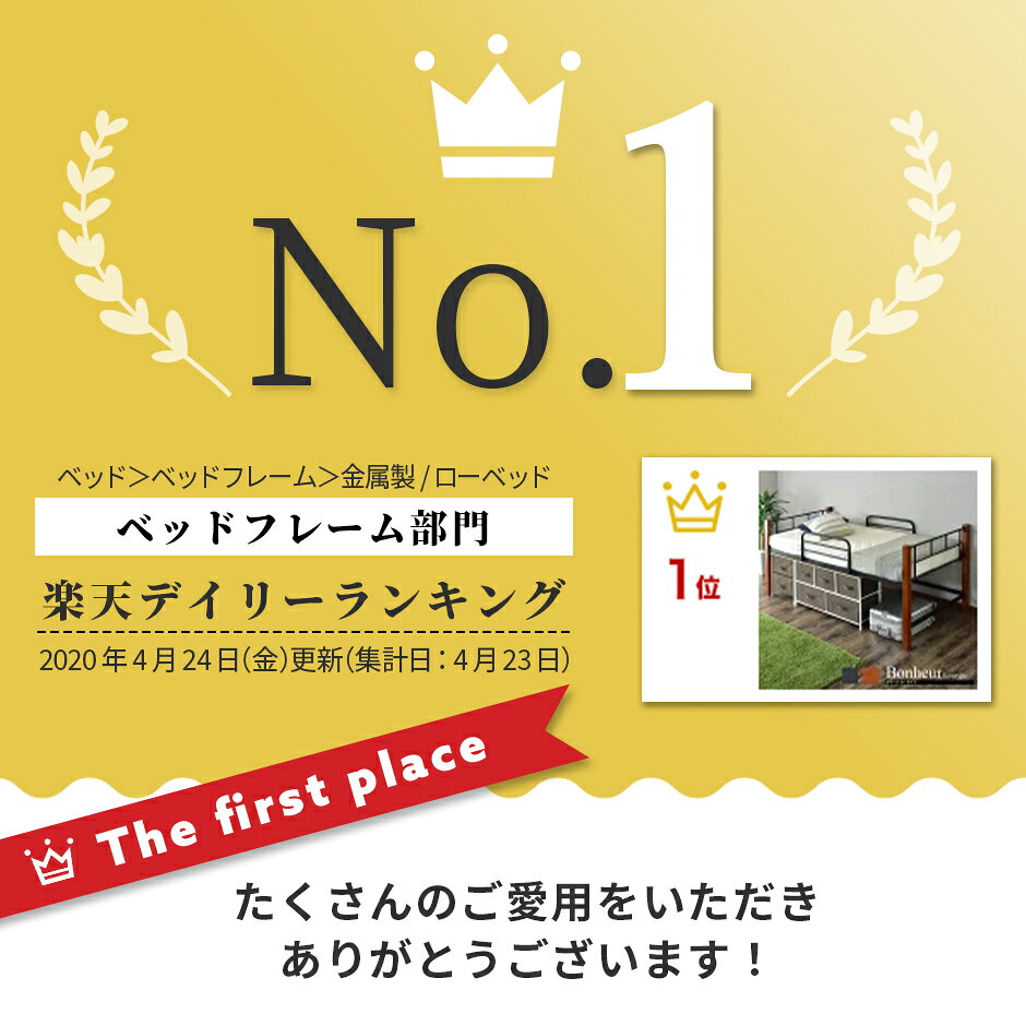 配送について 送料 無料 (北海道+10,000円・沖縄・離島・一部地域見積り) ●商品詳細 -infomation- 商品名 ロフトベッド ボヌール 【Bonheur】Lowtype(ロータイプ) サイズ Lowtype(ロータイプ) :約W209×D102.5×H96(cm) 材 質 【構造部材】 スチールパイプ 脚:ラバーウッド 【表面加工】 スチールパイプ:粉体塗装 脚:タッカー塗装 重 量 本体重量:約34kg 耐荷重 耐荷重:200kg 梱包サイズ 〈2-1〉幅106×奥行100.5×高さ13(cm)/約30.5kg(梱包材含む) 〈2-2〉幅99.5×奥行25.5×高さ6.5(cm)/約16kg(梱包材含む) 備 考 組み立て時間 90分(2人) ※組み立ては必ず2人以上で行ってください ※ベッドフレームのみの販売となります。